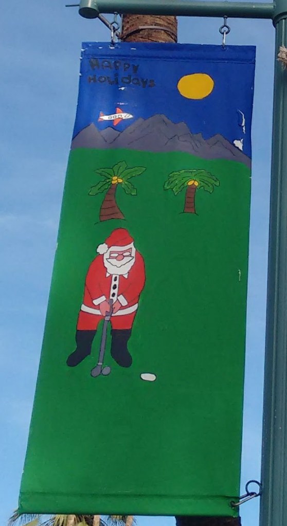 Fun holiday flags adorn Palm Canyon Drive.