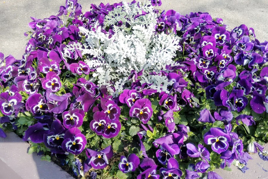 A planter of purple pansies greet visitors outside the Tourist Office. A planter of purple pansies greet visitors to the Tourist Office.