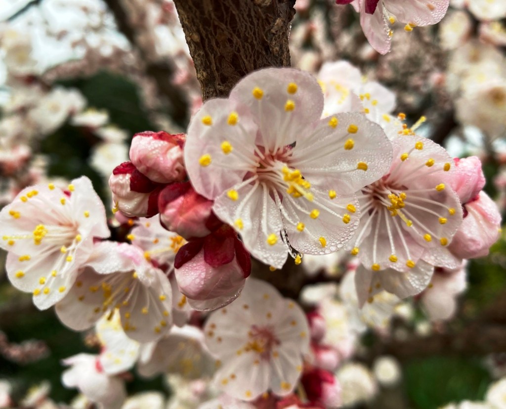 Dew-tipped almond blossoms, pretty in pink…
