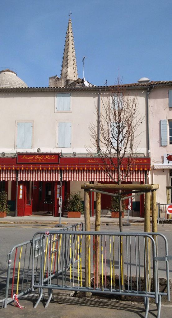 Wooden posts and metal barriers protect the newly planted young trees–they replace the diseased plane trees that, sadly, had to be removed.