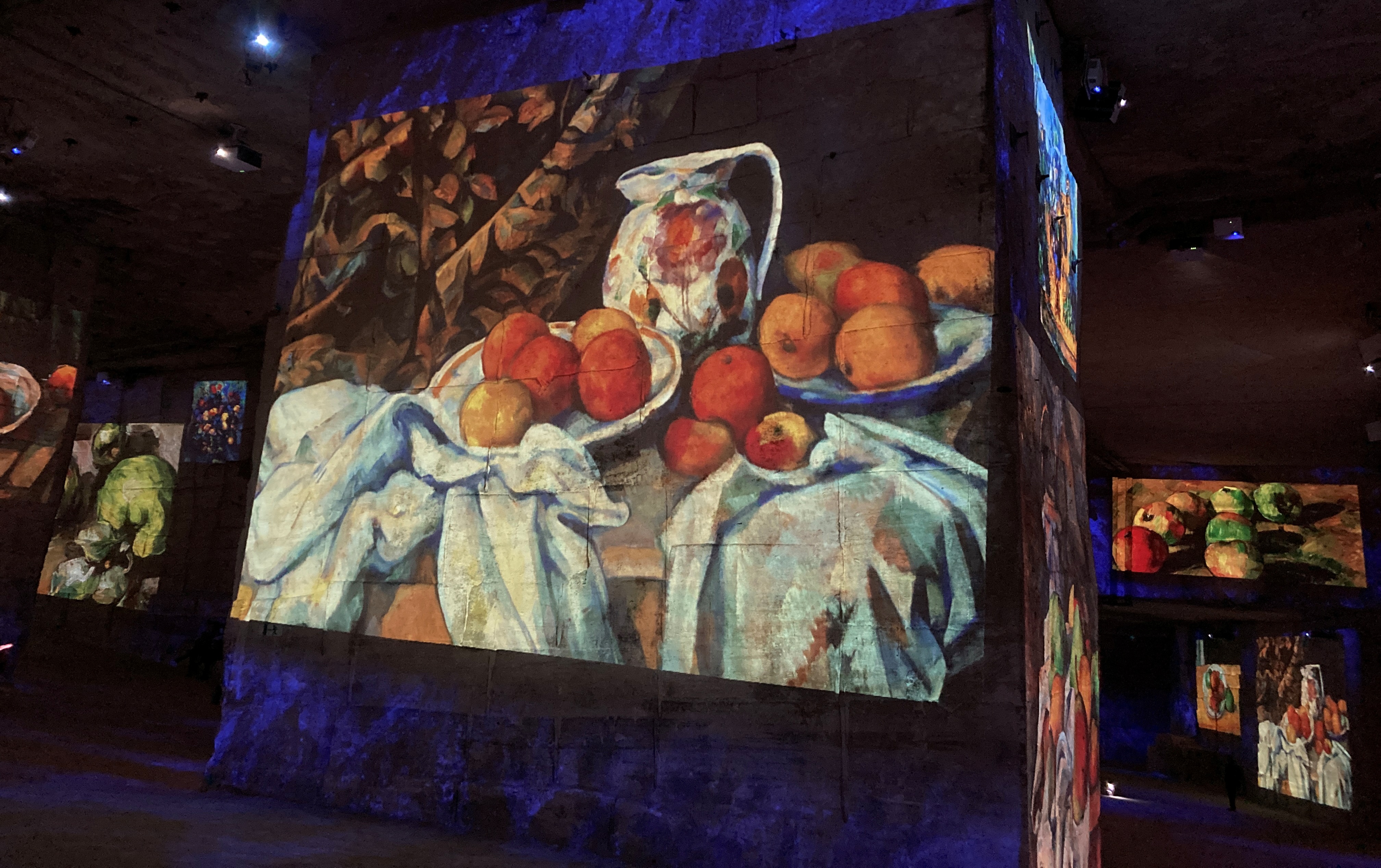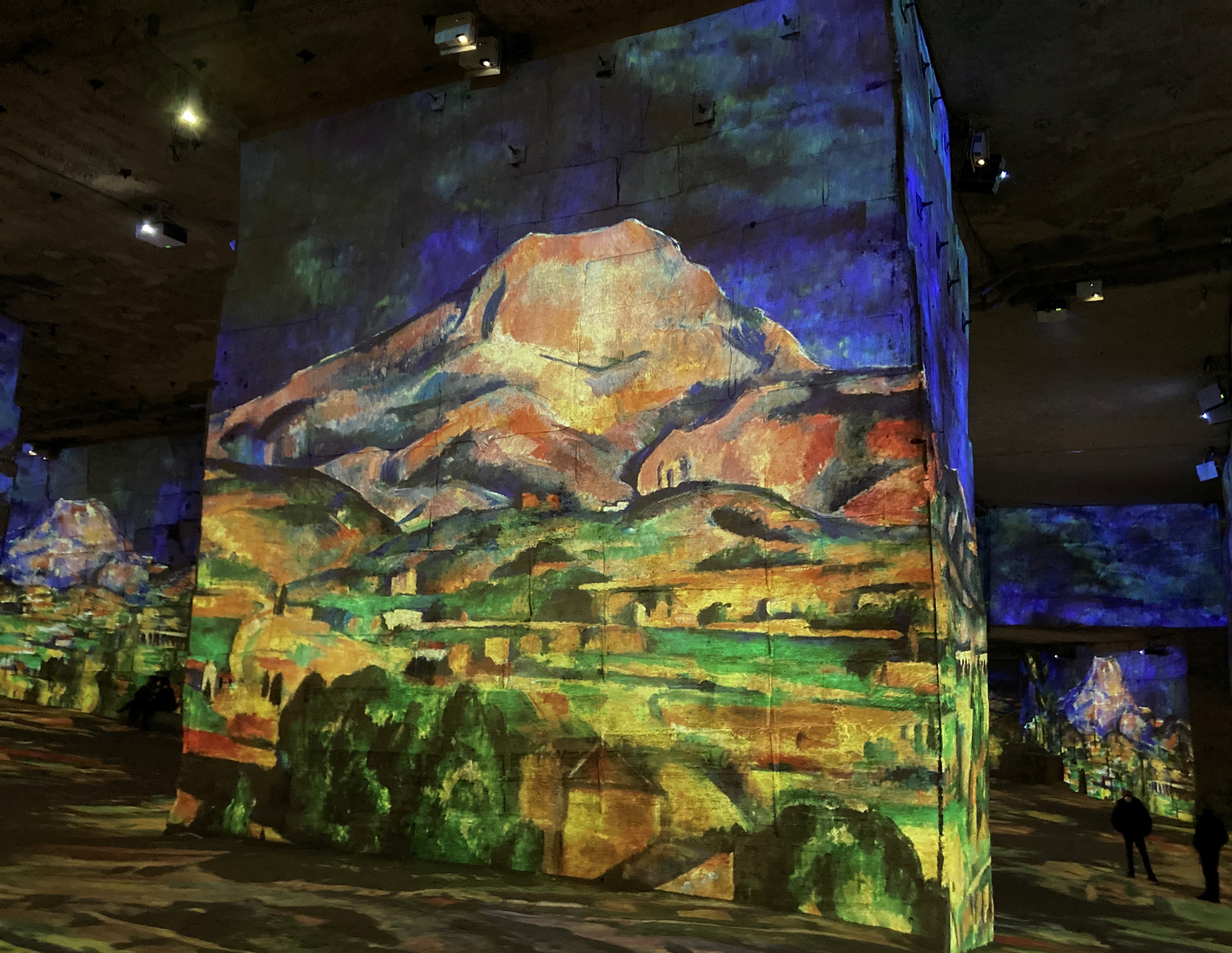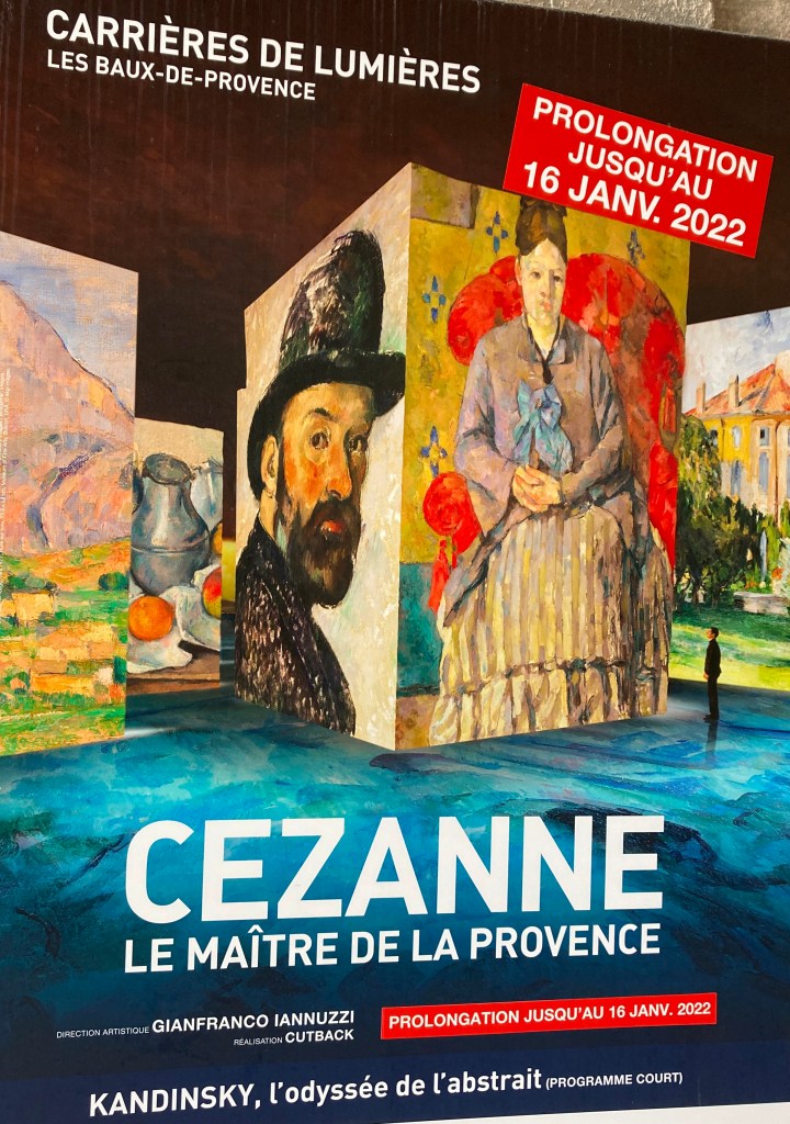 Aside from nature forays, there’s a special cultural event we look forward to in winter–the stunning quarry-turned-art venue, called Carrières de Lumières. (It’s open year-round, but we save it for winter when we have it practically to ourselves.) Photos are projected onto the monumental walls of the multi-chambered interior, accompanied by rousing musical scores from classic symphonies to pop tunes. Themes change yearly and just recently we finally witnessed the current show, “Cezanne, Master of Provence,” which began early 2021 and just closed. (The program also included some abstract works by the Russian painter, Wassily Kandinsky.)