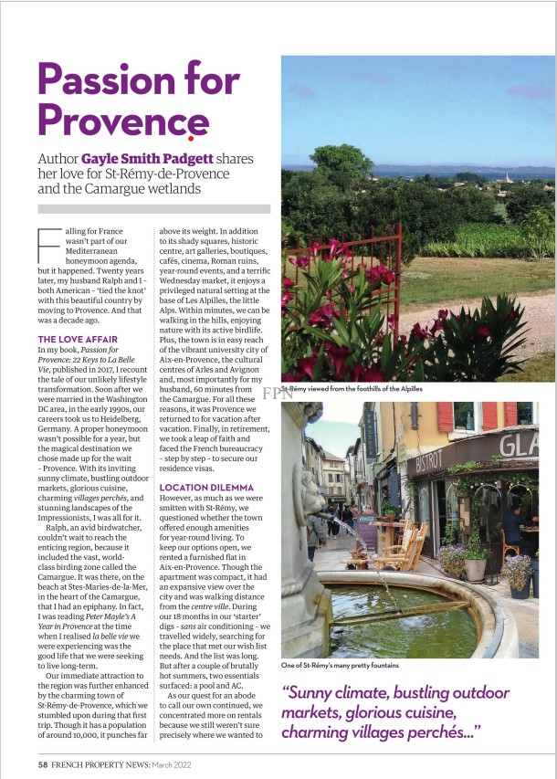 Hi Gayle and Ralph, Scott did it again! Leave it to him to have a subscription to France Property News, and to send me the article you wrote Passion for Provence with several color photos. Needless to say, I am much enjoying the forward. I’m so happy to know you’re getting coverage here and there for your excellent book on Provence. I certainly treasure my copy. I hope this note finds you both healthy and happy, Katherine