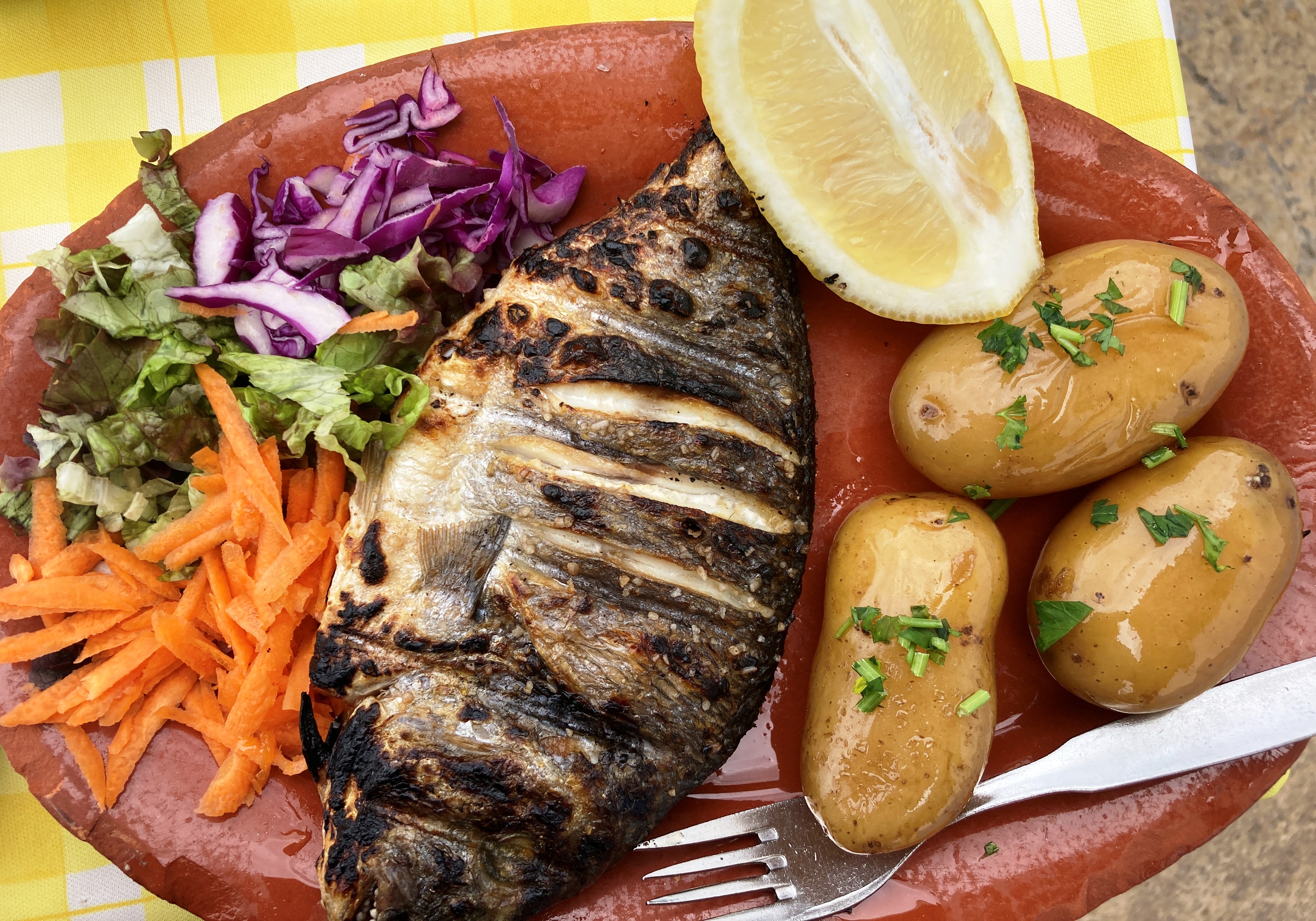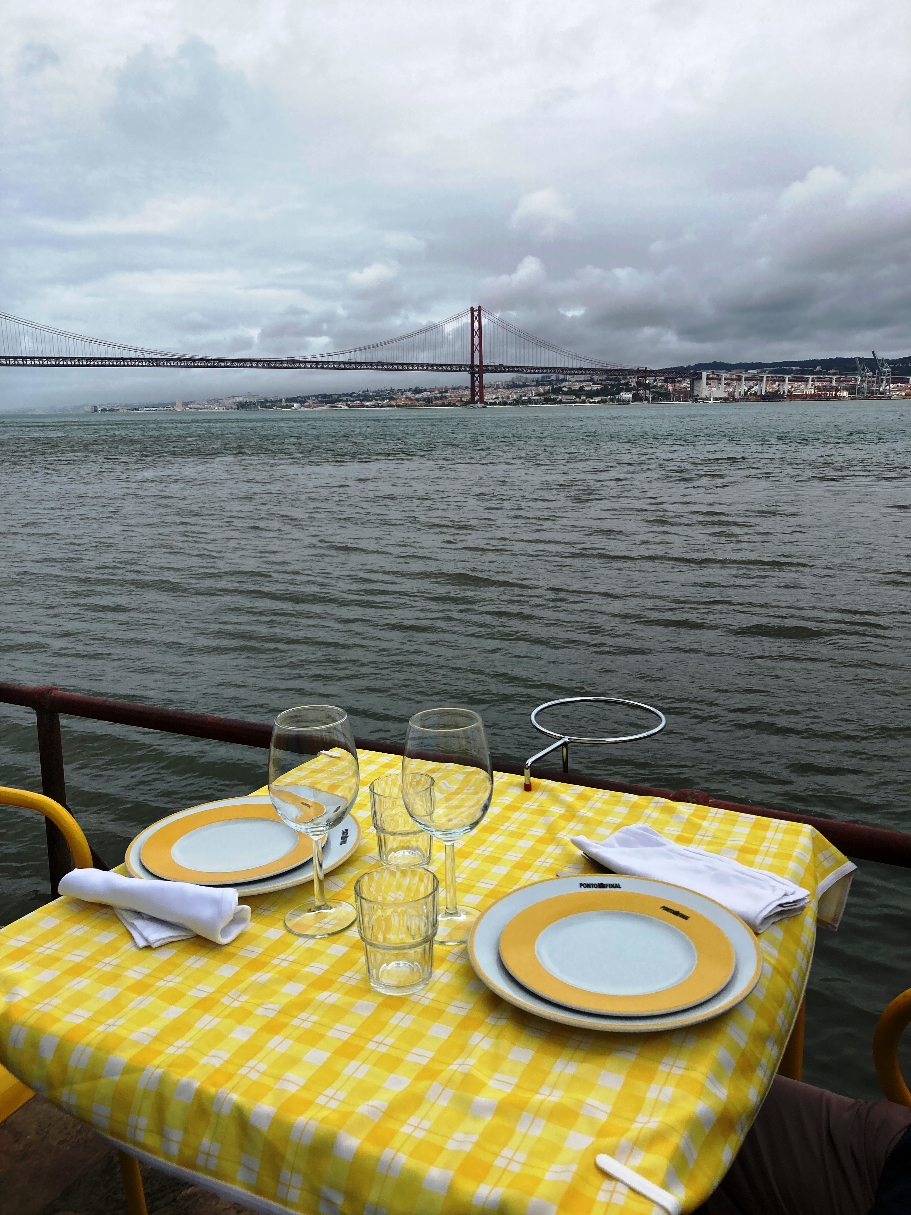 When our trip to Casçais was thwarted for a second time—this day due to a train strike—we hopped on a ferry for the short ride to other side of the Tagus River. We walked around the weathered village of Cacilhas, had a coffee, and then, guess what, it was lunch time! Unprepared for this spontaneous side trip, I had no restaurant ideas, but Google came to the rescue. We walked along the river boardwalk past blocks of graffiti and the occasional fisherman until around noon when we arrived at our destination, Ponto Final. The restaurant staff was busy setting the tables, preparing for the 12:30 opening. One helpful guy paused to inform us that without a reservation, we’d need to queue up behind the three ladies seated on the nearby cement steps and hope for the best; at 12:30, they’d begin compiling a waiting list. Surprised at the formality at this out of the way, casual nook, we followed orders. We were soon enlightened by an Israeli tour guide who joined the dining hopefuls. She explained that a few years ago the place had been featured on the TV series, Somebody Feed Phil. Mystery solved! The grilled fish was excellent and the view of Lisbon outstanding!