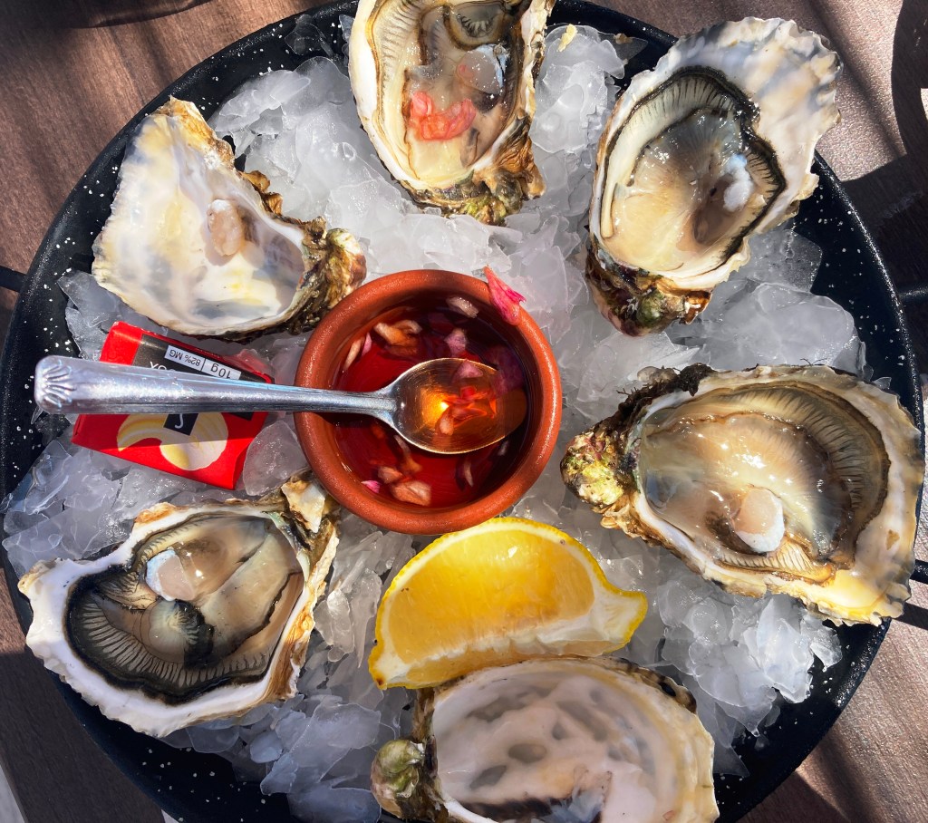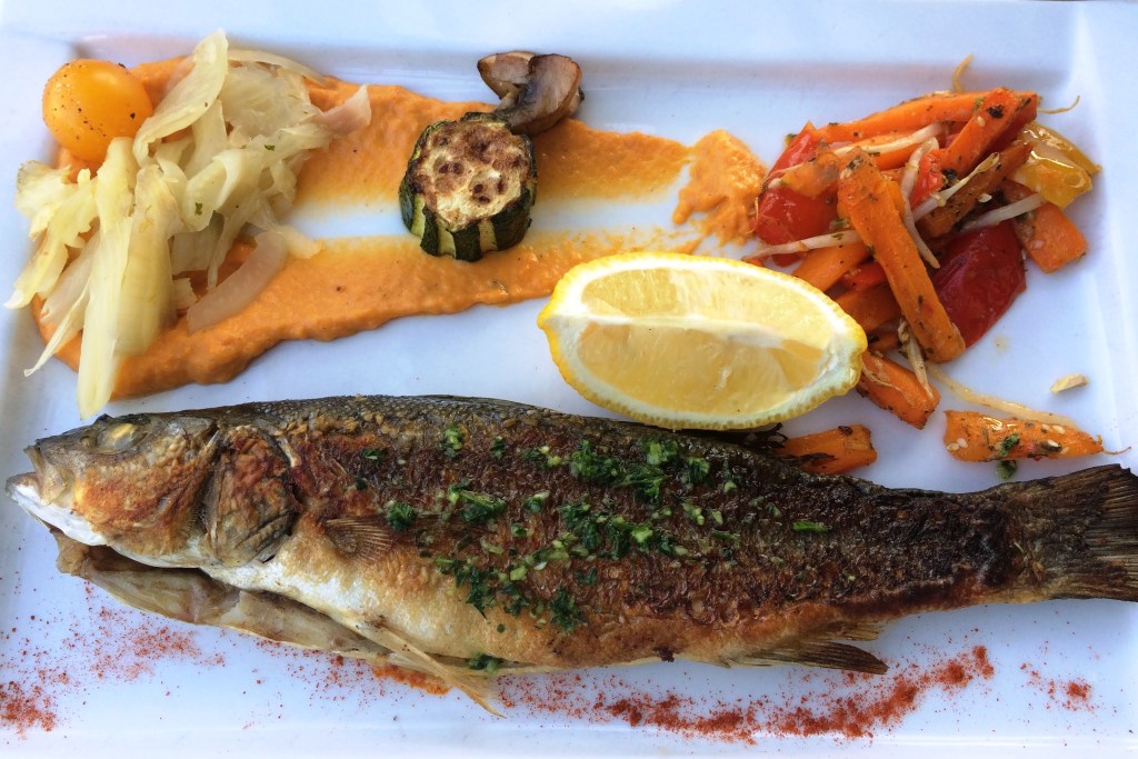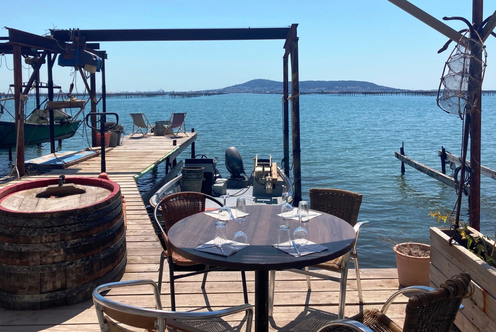 Our destination restaurant outside the oyster capital of Bouzigues (near Mèze) sits right on the lagoon with Sète in the distance. Sadly, our first choice for our seaside seafood repast, Les Desmoiselles Dupuy, was full, but at a neighboring enterprise, Benvenu’ Thau, we enjoyed a satisfying assortment of grilled huitres (oysters) four, ways—two each sprinkled with Parmesan, leek, hazelnuts and parsley, respectively. And, we also devoured the natural type. By the way, I’ll go out on a limb here and declare, “Never say never when it comes to raw oysters.” Never-ever was I a fan of these bivalve mollusks but the Bouzigues variety splashed with a magical vinaigrette with minced shallots made me a believer!