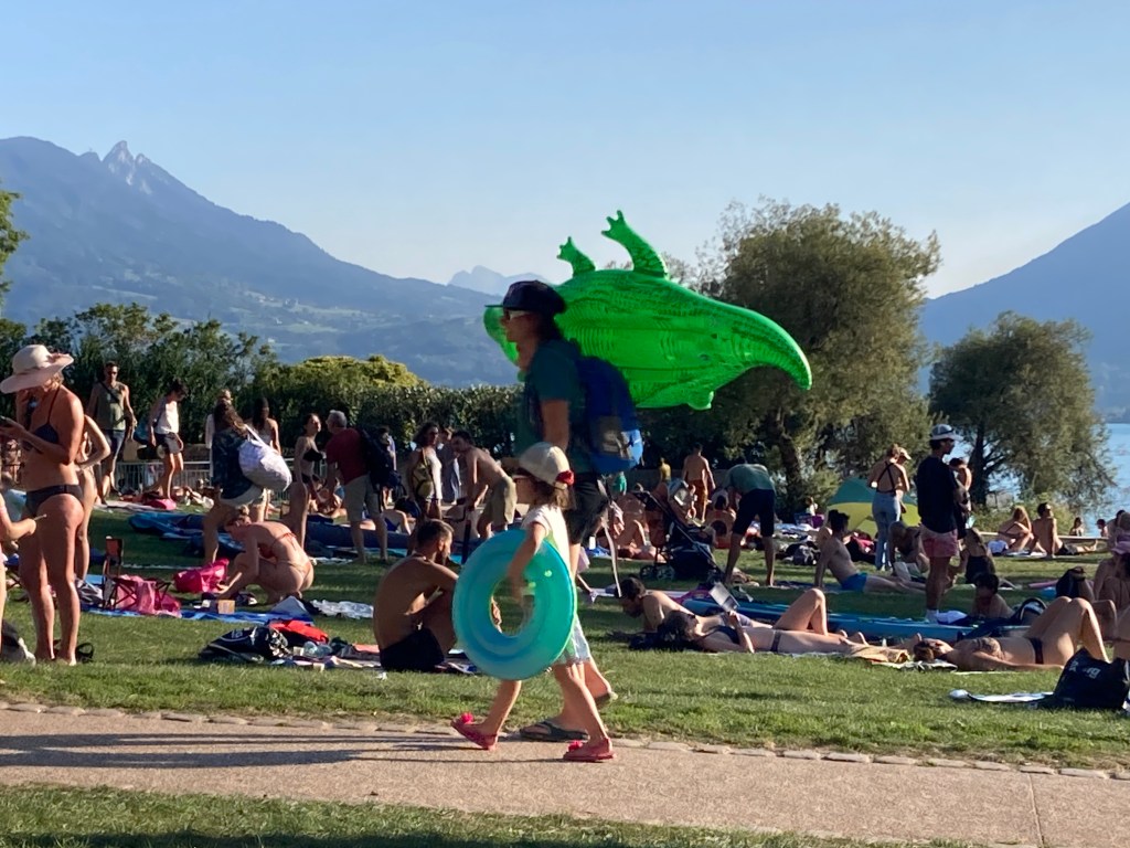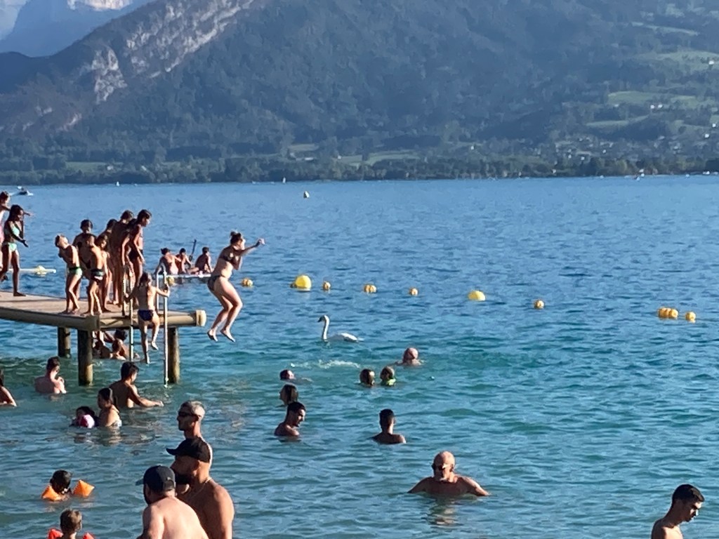 Happy to not fly through the air with the greatest of ease (and angst!), we opted for terra firma, bicycling and hiking, plus occasional dips in the pristine lake. The weather was unseasonably warm—in the high 80s F—so no matter where we were, we weren’t alone. In fact, over the weekend, it seemed the entire region came outside to soak up the rays, whether it be on the grassy slopes by the beaches, on the lake, or along the biking trail—everywhere was jammed to the gills. For example, we shared the cycle path with loads of folks on all forms of e-cruisers, Tour de France-like speedsters, young parents with kid-carriers attached to their bikes and elderly couples slowly peddling home after a grocery shop. You really had to faire attention!