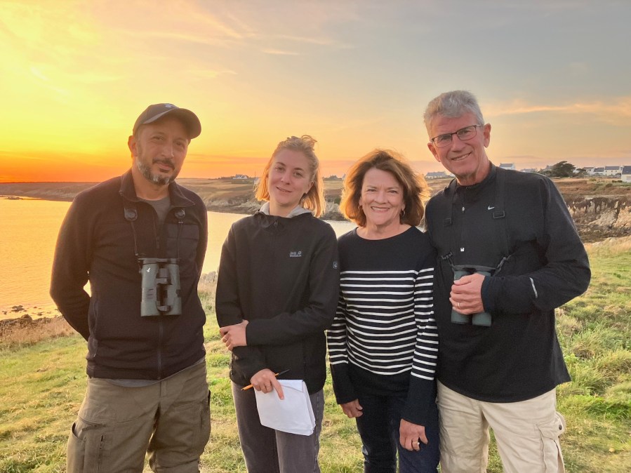 Nidal Issa, Aurélie Sipos, journalist with Le Parisien, Gayle and Ralph, as the sun sets in Ouessant