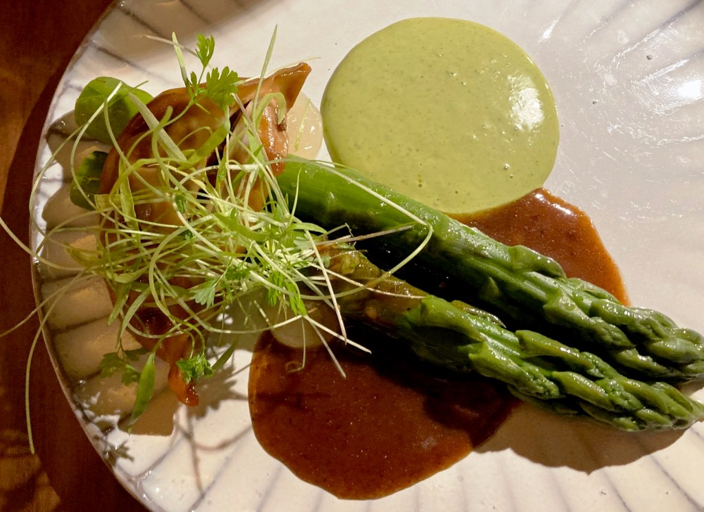 Throughout the meal, we’d been sipping a delightful recommendation by Nienke, the engaging sommelier and server. After inquiring about our tastes, she’d poured a dry white wine from Domaine de Laballe called Sables Fauves. We thoroughly enjoyed it and relayed that message to Niente and Chef Chiri who noted it comes from the Landes department, south of Bordeaux.