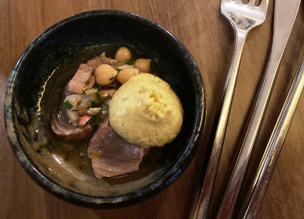 The day we were there, while we waited for our starter, he kindly offered us a yummy chickpea dip punctuated with lemon confit, which gave it a delightful punch. Afterward, we enjoyed the bubbling hot, crunchy-topped appetizer of a goat cheese melange made with loads of garlic, olive oil and fresh herbs—fabulous! Ralph chose the extraordinarily delicious stuffed veggies—he offered a bite!—and I devoured a moist, herby turkey roulade in a rich reduction sauce, served with a colorful array of charred vegetables and a ramekin of a creamy polenta.