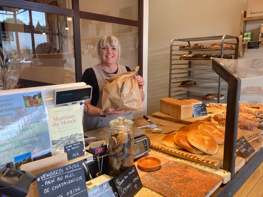 Great for lovers of lamb.Free range poulet from Pons.Frédérique ready to hand over my hearty wheat loaf, pain complet.