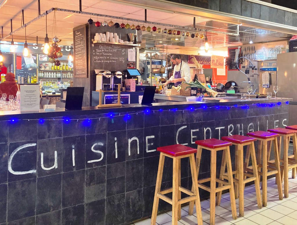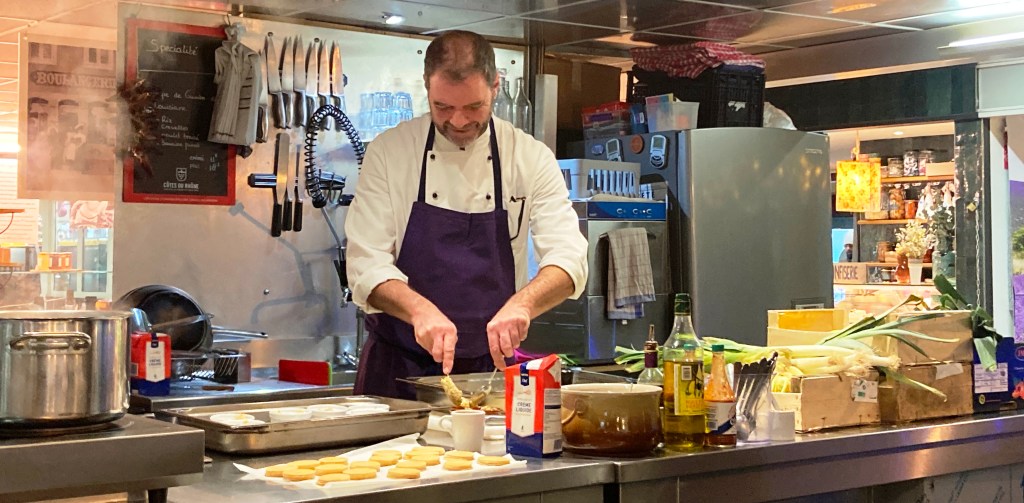 And a wonderful meal is exactly what’s found at Cuisine Centr’Halles, talented American Chef Jonathan Chiri’s restaurant. This charismatic Californian native earned his refined cuisine stripes at top restaurants around the world, to include the Michelin-starred restaurant at the 5-starred luxury hotel La Mirande right around the corner in Avignon. (He also taught at their cooking school.) For lucky guests at his restaurant tucked into Les Halles, he prepares fresh, inventive, scrumptious lunches in an open-plan arrangement.