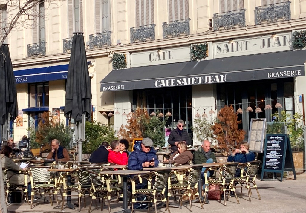 Patrons of Café Saint-Jean soak up the morning sunshine.