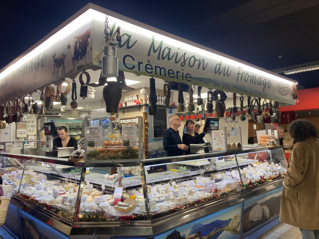 On Place Pie, we joined a dozen other sun worshipers on the terrace of Café Saint Jean for a café noisette, an espresso with a dollop of hot foamy milk. Afterward, we cruised the aisles of the historic indoor market called Les Halles, admiring the bounty of fruits, vegetables, pastries, seafood, meat, fromages, and spices—pretty much everything needed to compose a wonderful meal.