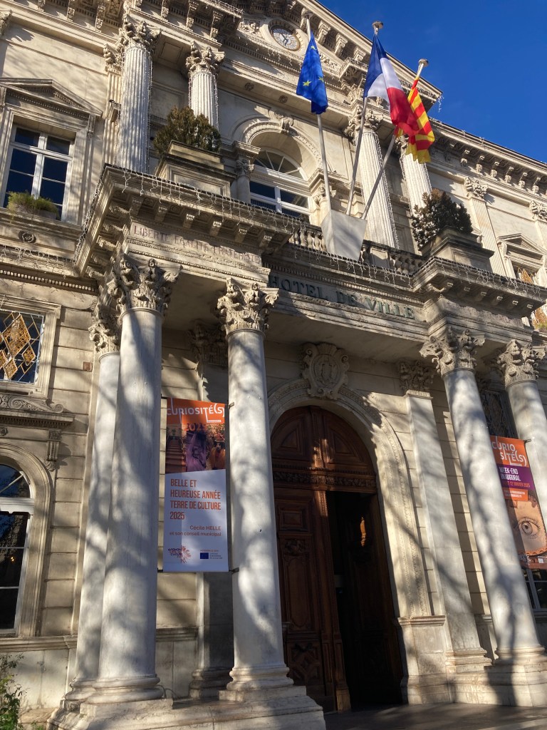 A banner at Avignon’s City Hall wishes all a lovely and happy New Year 2025.