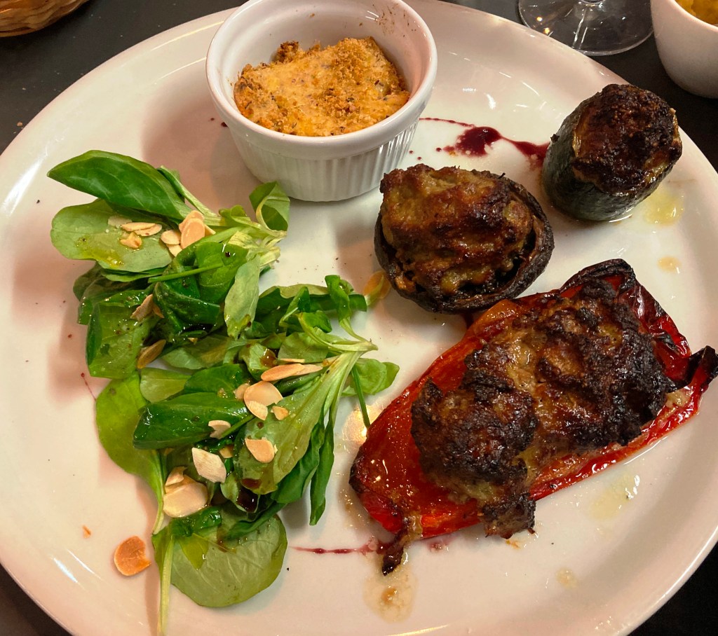 The day we were there, while we waited for our starter, he kindly offered us a yummy chickpea dip punctuated with lemon confit, which gave it a delightful punch. Afterward, we enjoyed the bubbling hot, crunchy-topped appetizer of a goat cheese melange made with loads of garlic, olive oil and fresh herbs—fabulous! Ralph chose the extraordinarily delicious stuffed veggies—he offered a bite!—and I devoured a moist, herby turkey roulade in a rich reduction sauce, served with a colorful array of charred vegetables and a ramekin of a creamy polenta.