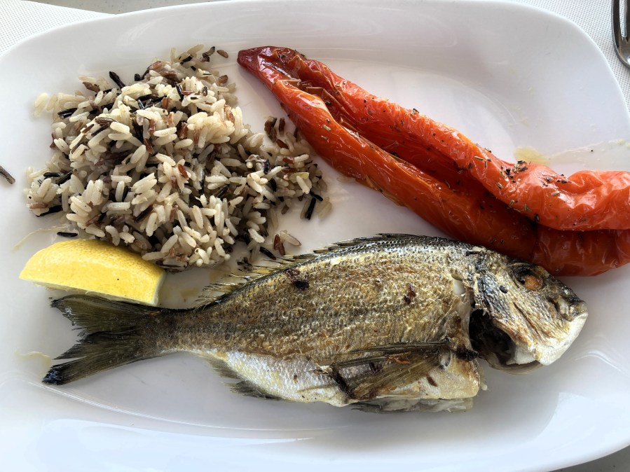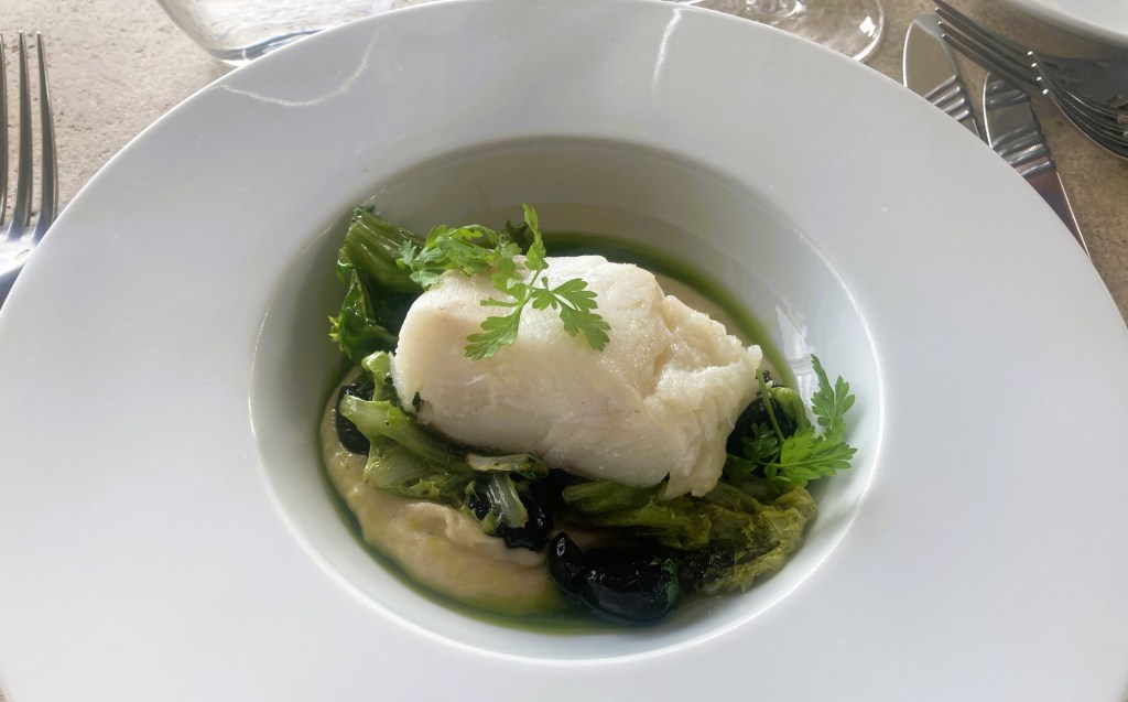 The owners weren’t on site, but their staff couldn’t have been more welcoming and gracious, seating us in the area near the floor to ceiling sliding doors, where we marveled at the expansive Luberon valley view. Then we marveled at the lunch. Our scrumptious meal began with a fresh and flavorful cod confit, resting on a bed of thick hummous-like cream, with escarole and olives. For the main course, I ordered gnocchis à la romaine—large, thick disks made with semolina flour instead of potatoes—set on Parmesan sauce, surrounded by bright green broccoli flowerettes—delicious. Ralph opted for the filet de pintade, guinea fowl, with creamy fennel-infused polenta. Mais oui, he shared a few bites—deeply rich and yummy.