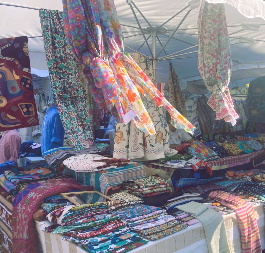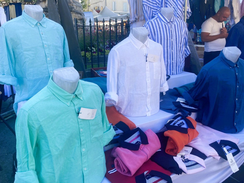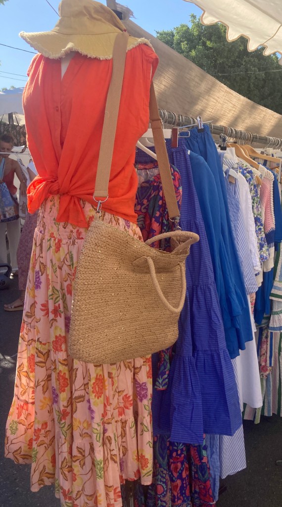Pretty woven carrier bagsColorful scarves blowing in the breezeBag your basket here!Summery linen shirts for monsieurSwingy skirts and billowy dresses help beat the heatChapeau, anyone?Ceramic bowls shimmer in the sunVintage treasures galore