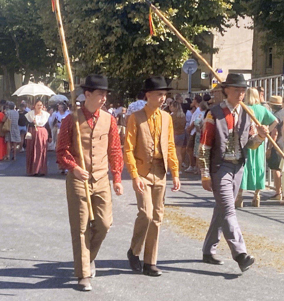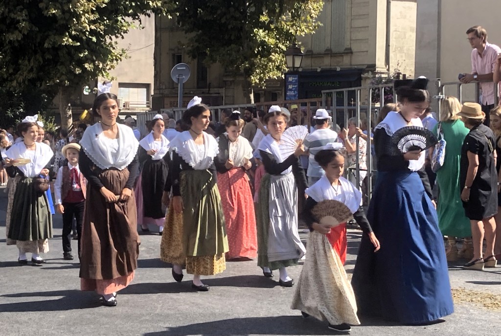 Of the variety of happenings, one event not to miss is the Défilé de la Carreto Ramado, the elaborate parade that includes the fabulous Arlésiennes, dressed in period costumes. An enormous cart decorated with colorful flags, green foliage, highlighted with braids of garlic, sunflowers, and bouquets of lavender, leads a procession of dozens of linked-together draught horses, sporting ornate harnesses festooned with pompoms and ribbons. It’s quite the spectacle! Have a look: