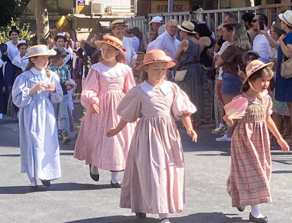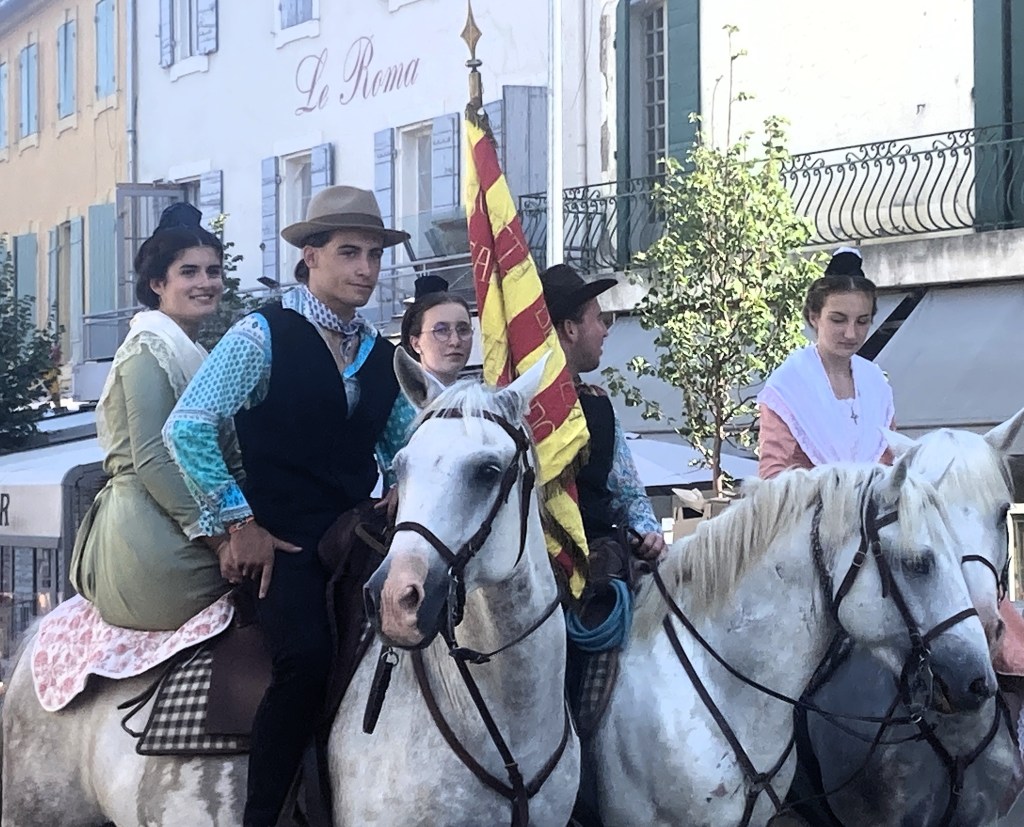 Traditional attire of long-sleeved shirts and vests are de rigueur though temps tip toward 100F.Little girls sporting straw bonnets walk with purpose.Young equestrians promote the revered traditions.Sitting tall and proud in the saddle.Atop a horse-drawn carriage, a couple makes the rounds in comfort.Mayor Chérubini enjoying the festivities.Some female equestrians sit side-saddle, their long gowns flowing over their steeds.The post-parade party spills into the street.