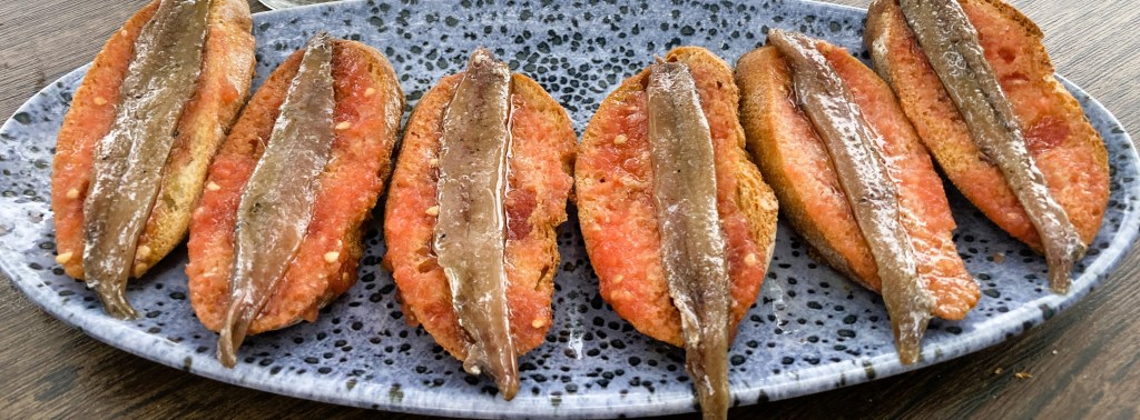 Anchovies atop a slice of crusty country bread make for a popular tapas dish.The Church of Santa Maria crowns Cadaqués.Tapas at L’Estable in Cadaqués.