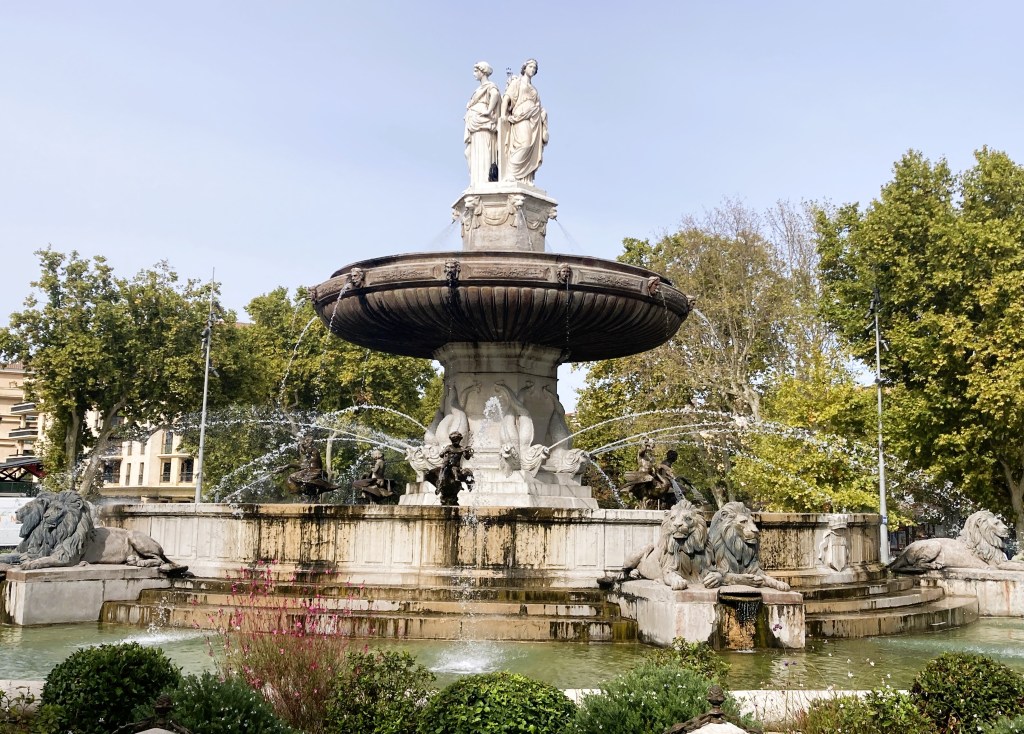 La Fontaine de la Rotunde welcomes visitors to Aix-en-Provence, a city of art and culture.