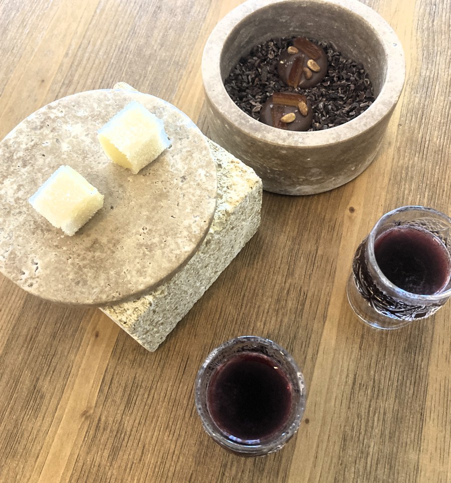We finished our surprise refined lunch with coffee, which arrived with several mignardises, sweet treats: a pineapple cube wrapped in a delicate almond-based coat, pralined chocolates, and a shot glass filled with zingy apple-ginger-myrtylle-lime juice—all wow!