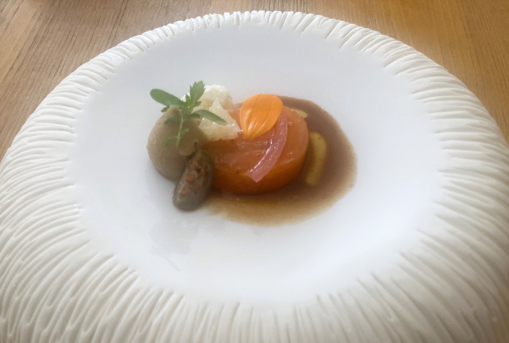 Throughout the meal, we’d been sipping a delightful recommendation by Nienke, the engaging sommelier and server. After inquiring about our tastes, she’d poured a dry white wine from Domaine de Laballe called Sables Fauves. We thoroughly enjoyed it and relayed that message to Niente and Chef Chiri who noted it comes from the Landes department, south of Bordeaux.
