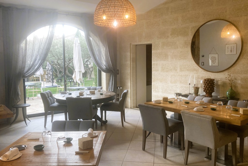 The countryside hotel-restaurant La Belle Vie near the Pont du GardThe stylish dining room